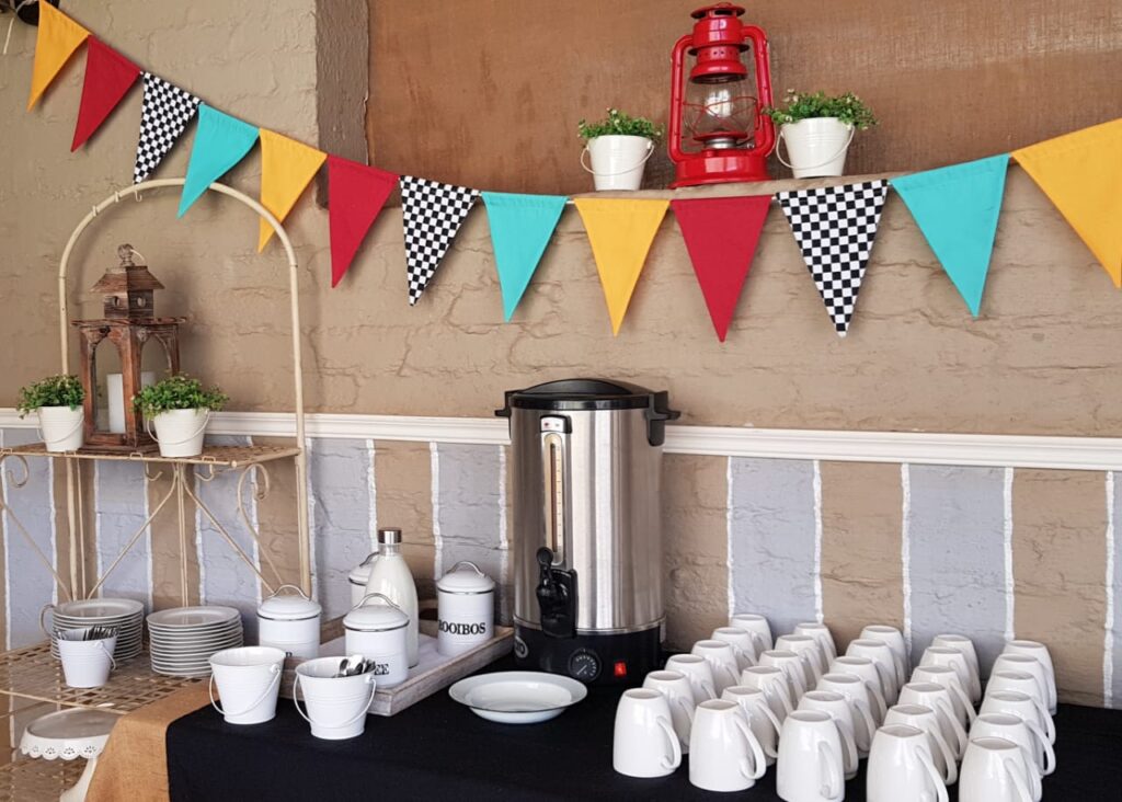 To add to your décor, fabric bunting and table cloths to match the colours of your party theme are included in the venue hire fee. As well as the crockery and cutlery for both the adults and kids. Tea, coffee, milk & sugar for the adults & oros on tap for the kids, use of the Hot water urn and Hot tray – everything that you might need to make your event a success.